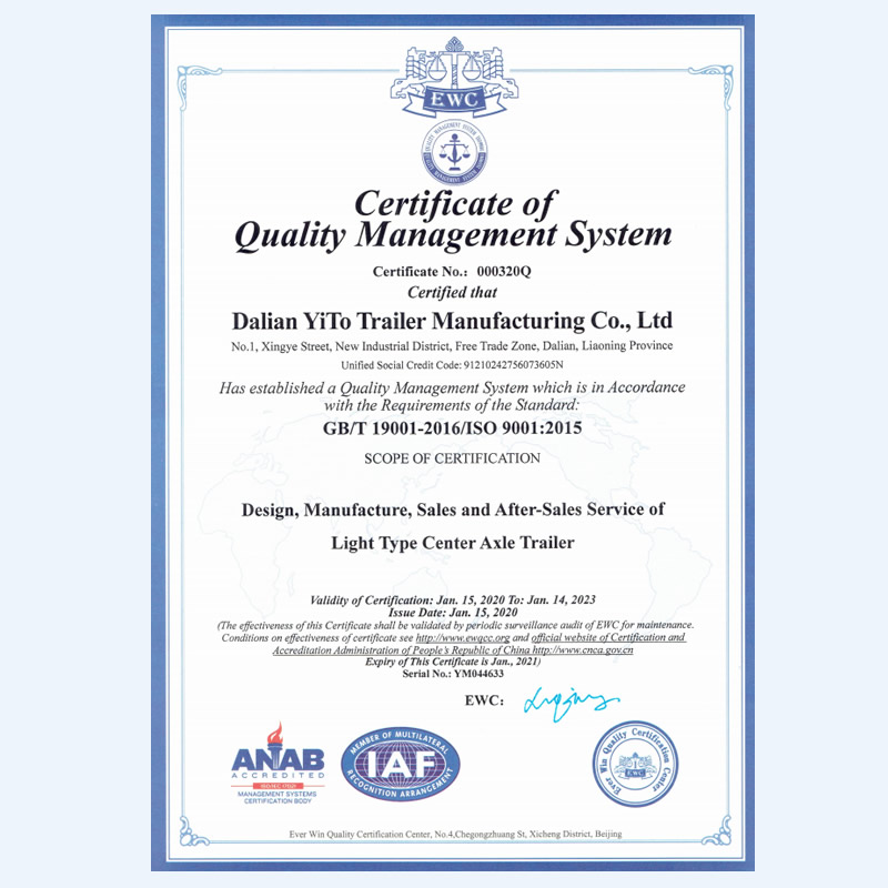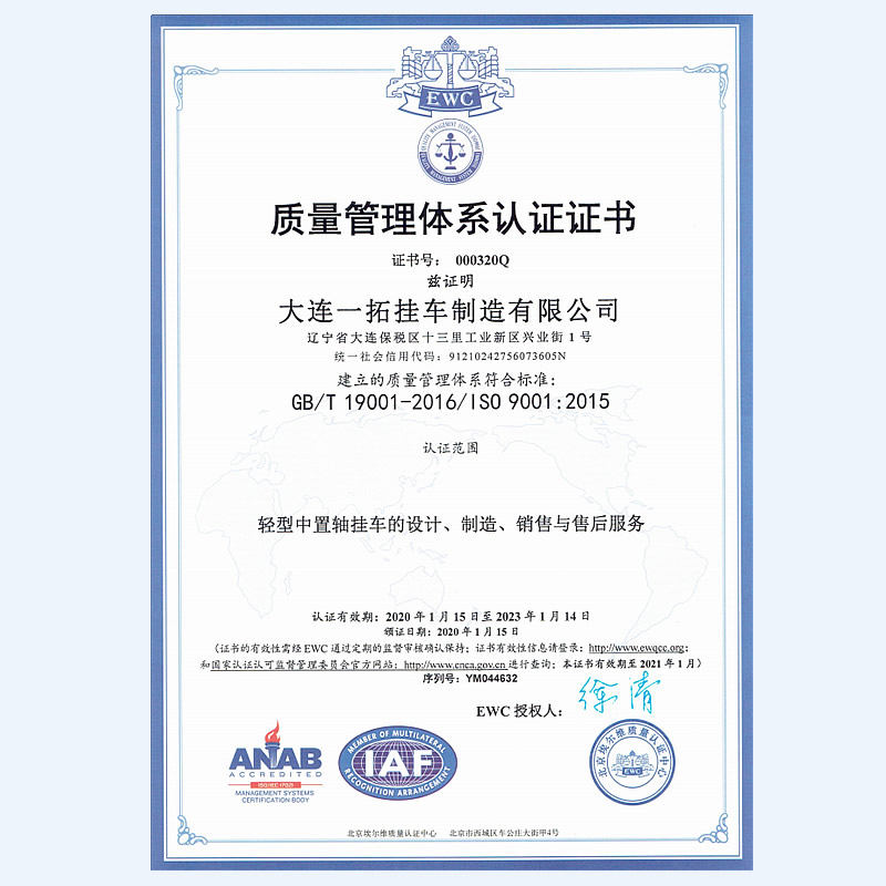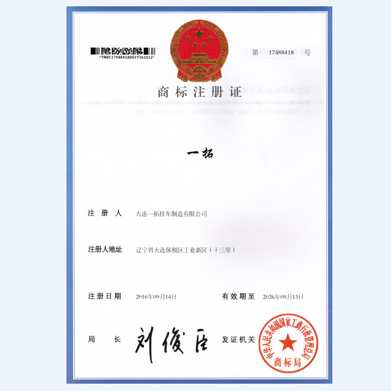 大連一拓掛車制造有限公司,地處遼寧省大連保稅區十三里工業新區興業街1號,公司占地45000m㎡,總建筑面積24000㎡,現有生產、檢測、研發(fā)設備100余臺套,擁有自動化程度很高的機器人焊接生產線。大連一拓掛車制造有限公司成立于2013年,是一家具備國家工信部專用車生產資質企業,致力于乘用車掛車的設計和生產,主要產品有:平板板式輕型中置軸掛車、欄板式輕型中置軸掛車、廂式輕型中置軸掛車、特種結構式輕型中置軸掛車,并承接各種用途輕型中置軸掛車設計等業務。公司秉承“銳意進取,開拓創(chuàng)新,精益求精,誠信共贏”的運營理念,竭誠為您服務。